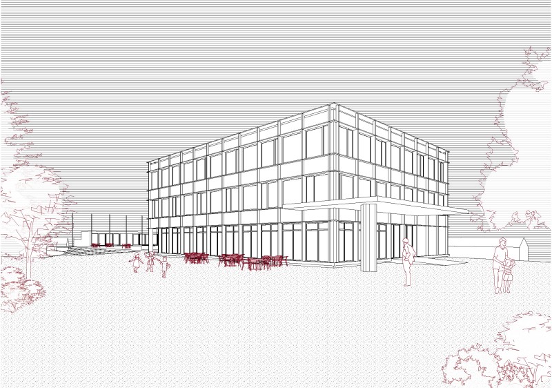 Der Entwurf schlägt vor einen neuen Gebäudekörper auf der Geländekante zwischen Rasenpielfeld und Pausenplatz zu positionieren. Das Gebäude ist, wie die Bestandsbauten, zum Pausenplatz hin adressiert und schliesst mit einer neuen Pausenhalle an das bestehende Schulhaus an. Sie bildet den zentralen Ankunftsort, der zugleich den Neubau wie auch das Bestandsschulhaus erschliesst und zwischen Alt und Neu vermittelt..